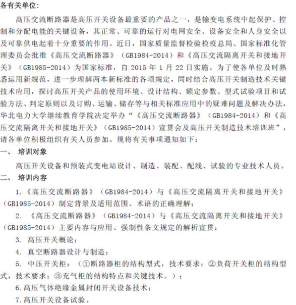 具体情况内容见附件 [点击浏览该文件:关于举办高压培训班的通知.doc]