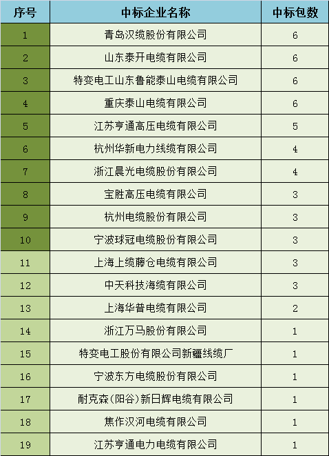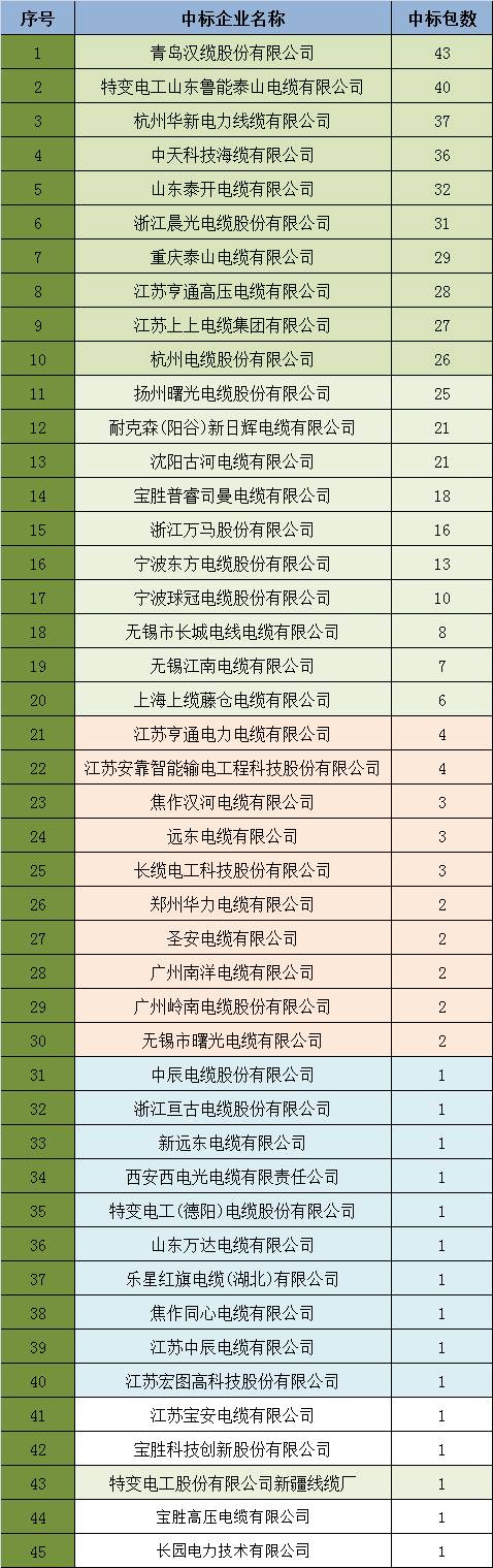 前十家电力电缆企业中标包数占总数的64%,分别是青岛汉缆股份有限公司、特变电工星空(中国)鲁能泰山电缆有限公司、杭州华新电力线缆有限公司、中天科技海缆有限公司、星空(中国)泰开电缆有限公司、浙江晨光电缆股份有限公司、重庆泰山电缆有限公司、江苏亨通高压电缆有限公司、江苏上上电缆集团有限公司、杭州电缆股份有限公司。