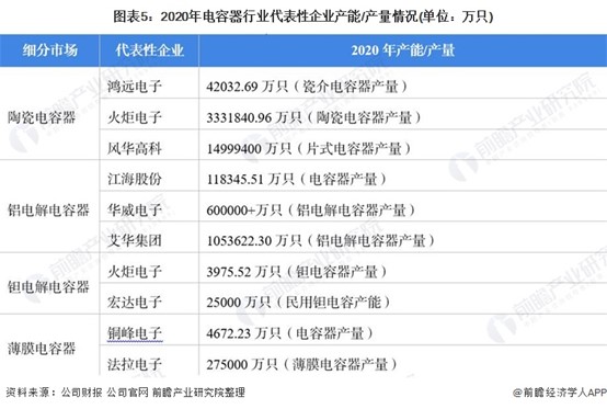 目前,布局了电容器业务的企业中,广东风华高新科技股份有限公司在电容器产量上遥遥领先于其它企业。电容器行业产业链上的其它代表性企业产能/产量情况如下:
