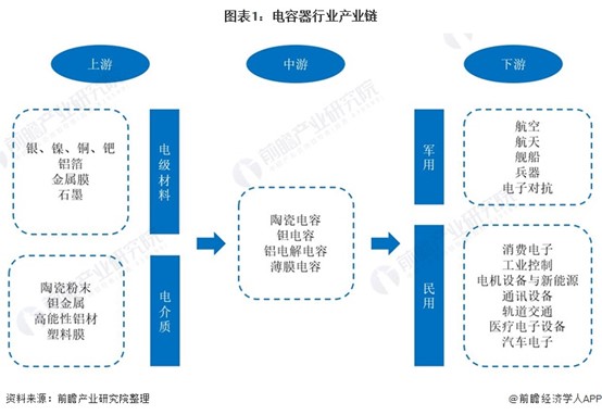电容器产业链上游为电极材料和电解质材料行业,下游行业主要应用于军用和民用领域,军用领域包括航空、航天、舰船、兵器、电子对抗等,民用领域包括消费电子、工业控制、电力设备及新能源、通讯设备、轨道交通、医疗电子设备及汽车电子等。