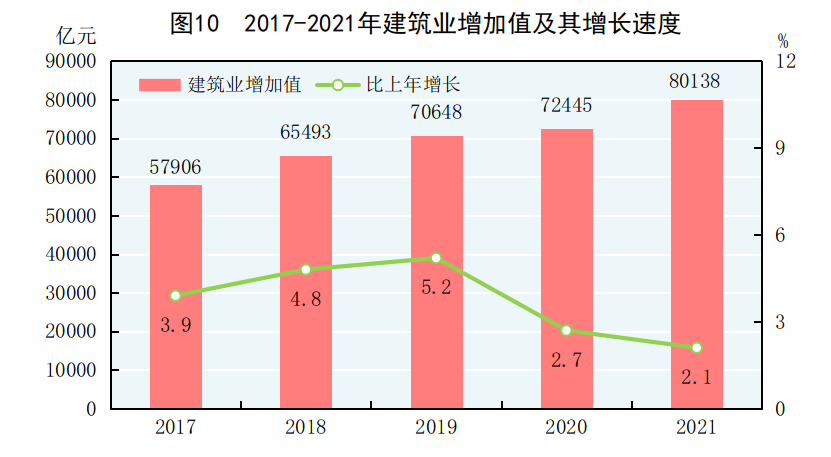 全年建筑业增加值80138亿元,比上年增长2.1%。全国具有资质等级的总承包和专业承包建筑业企业利润8554亿元,比上年增长1.3%,其中国有控股企业3620亿元,增长8.0%。