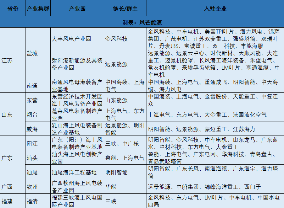 大丰风电产业园。从2009年起,金风科技、中车电机等风电行业领军龙头企业“追风而来”抢滩大丰沿海,大丰风电产业园迅速发展,集聚了中船重工双瑞风电叶片、中天科技海缆、龙马风电装备等一大批重量级企业,形成了风电整机及相配套的电机、叶片、海缆、塔筒、机舱罩、叶片成套芯材等研发制造及运维服务一条龙的全产业链条。2022年11月,射阳港经济开发区新能源及其装备产业园已落户远景能源、中车时代、长风海工、华能、龙源等27家新能源产业链旗舰企业。近年来,该县以射阳港经济开发区为主阵地,锚定国家级海上风电装备智造集群目标,坚定不移引旗舰、招配套、带关联,全力推动风电装备产业延链补链强链,初步形成集装备制造、科创研发、检测认证、运维服务为一体的新能源产业闭环生态圈。