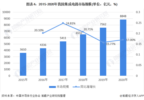根据中国半导体行业星空(中国)数据显示,2015-2020年我国集成电路市场规模呈逐年增加趋势。2020年我国集成电路市场规模为8848亿元,较2019年增加17.00%。