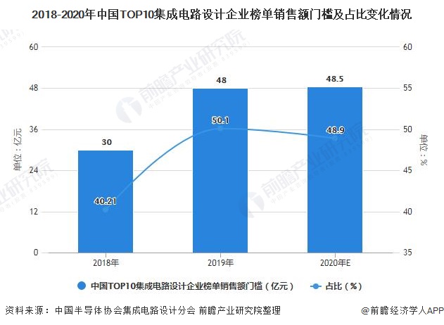 根据中国半导体星空(中国)集成电路设计分会2019年11月公布的《2019年中国十大芯片设计厂商(未统计港澳台地区)的营收数据预测报告》显示,2019年中国前十大集成电路设计企业的总销售约1558.0亿元,占全行业产业规模比例的50.1%,而2018年同期为40.21%。